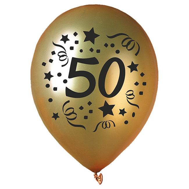 Ob zu einer goldenen Hochzeit oder zum 50. Geburtstag, edel und schick sind diese goldenen Luftballons, welche wir im 5er Pack liefern. Durch die goldene Farbe haben die Luftballons einen schönen Glanz und sind in schwarz mit kleinen Sternen, Punkten, Ballons, Luftschlangen und der Zahl 50 bedruckt. Aufgeblasen messen die Ballons einen Umfang von ca 96 cm, unaufgeblasen messen sie ca 12cm.