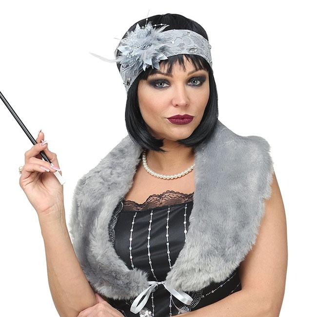 Das Accessoire-Set "Roaring 20ies" ist in Grautönen gehalten und wird in einer Einheitsgröße für Erwachsene geliefert. Es besteht aus zwei Teilen: Einer Stola, die mit Hilfe von Schnüren an der Vorderseite zugebunden werden kann, und einem Stirnband. Bitte beachten Sie, dass alle anderen Artikel, die Sie der Abbildung entnehmen können, NICHT vom Lieferumfang umfasst werden.