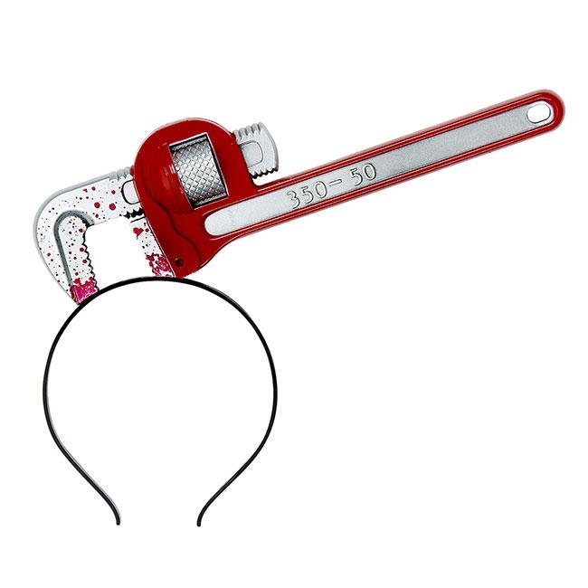 Der schwarze Haarreif "Blutige Rohrzange im Kopf" wird in einer Einheitsgröße für Erwachsene geliefert. An ihm ist eine blutbespritzte Rohrzange befestigt, die eine Länge von ca. 28 cm aufweist. Sie besteht aus Kunststoff, ist in den Farben Silber und Rot gehalten und steckt dem Träger anscheinend im Schädel.