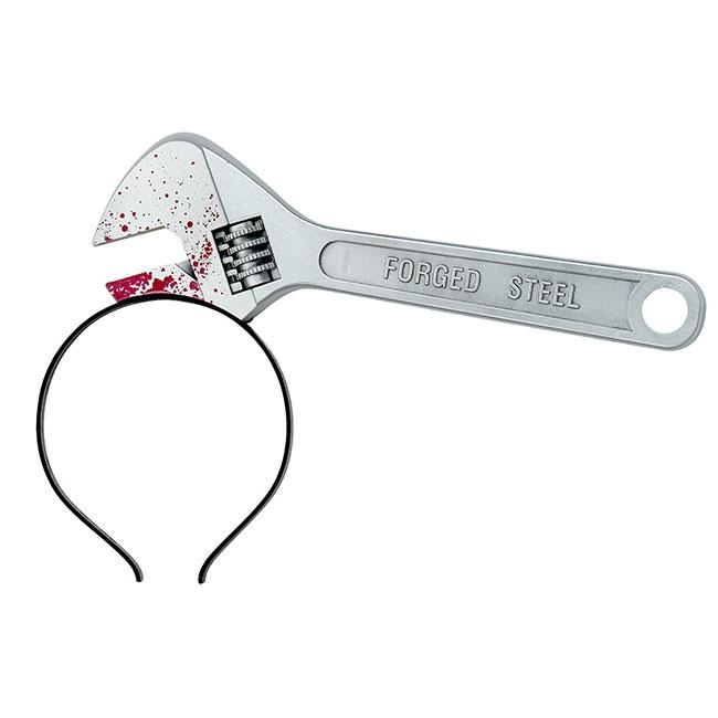 Der schwarze Haarreif "Blutiges Werkzeug im Kopf" wird in einer Einheitsgröße für Erwachsene geliefert. An diesem ist ein silberfarbener, ca. 27,5 cm langer Schraubenschlüssel aus Kunststoff befestigt, der beim Tragen den Anschein erweckt, als würde er im Kopf feststecken. Außerdem ist er mit Blutspritzern versehen. Ein wirklich gruseliger Haarreif!