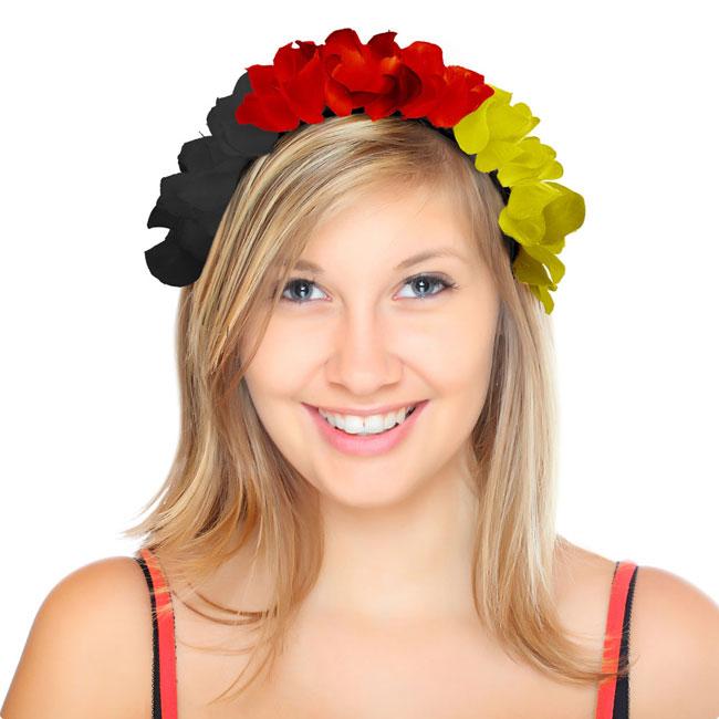 Mit der passenden Fan Deko und tollen Fanartikeln wird die deutsche Nationalmannschaft bestimmt siegen! Dieser süße Haarreif wird in einer Einheitsgröße geliefert und ist mit kleinen Blüten aus Stoff verziert. Diese sind natürlich in den Deutschland Farben schwarz-rot-gelb verziert. Ein tolles Accessoire für Mädels die im Fußball Fieber sind! Weitere Dekoartikel und Accessoires zum Thema Deutschland, WM und EM gibt es natürlich hier bei PartyDeko!
