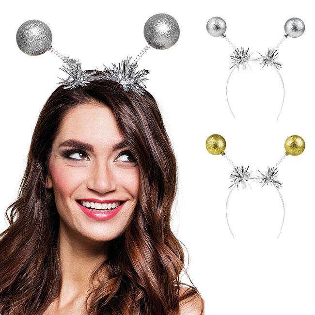 Dieser Haarreif mit seinen lustig wackelnden Glitzerbällen wird mit Sicherheit der Hingucker auf Ihrer nächsten Disco, Glamour oder Silvester Party. Es kann zwischen den Farben Silber und Gold ausgewählt werden, wobei sich die Farbauswahl nur auf die Kugeln bezieht. Der Haarreif ist aus transparentem Kunststoff. Die Metallfedern sind am Haarreif selbst noch mit silbernem Lametta und silbernen Lametta-Sternen dekoriert. Der hauchfeine Glitzer sorgt für einen atemberaubenden Effekt.