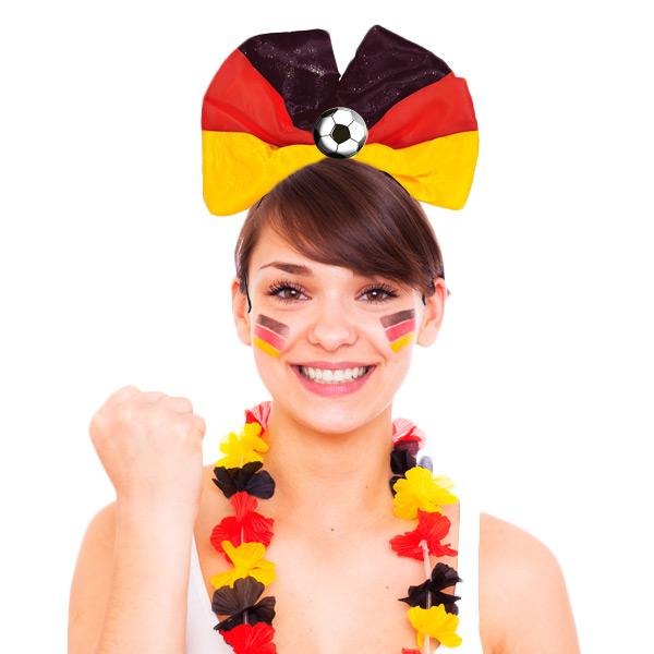 Der Haarreif mit Deutschland-Schleife und dem Fußball als Zierde lässt Sie so richtig niedlich wirken! Wer sich mit den Deutschland-Farben schmücken möchte, dem holden Geschlecht angehört und es so richtig krachen lassen möchte, der kommt an diesem tollen Haarreif absolut nicht vorbei! Endlich mal etwas anderes als die obligatorischen Hüte, Kappen und Mützen! Zeigen Sie, für welches Team Ihr Herz schlägt, und jubeln Sie mal wieder so richtig mit - egal, ob Zuhause, in Nachbars Garten oder beim großen Public Viewing.