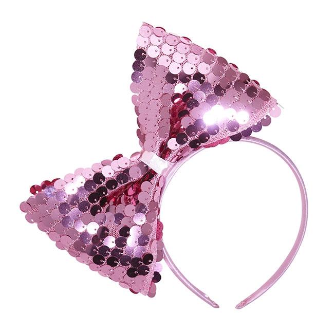 Mit diesem Haarreif ist man nicht nur ein Trendsetter, sondern kann auch sein Kostüm zu einem stylischen Hingucker verwandeln! Der Haarreif wird in einer Einheitsgröße geliefert. An dem Haarreifen ist eine XXL-Schleife befestigt, die mit funkelnden Pailletten bestickt ist. Der Haarreif ist in den Farben Pink, Schwarz oder Silber erhältlich.