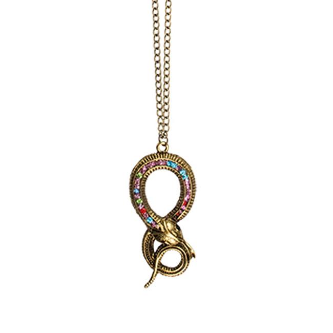 Die Halskette "Schlange des Nils" ist doppelt gemessen ca. 38,5 cm lang (Umfang ca. 77 cm) und besteht aus goldfarbenem Metall. Der ca. 3 x 7 cm große Anhänger hat die Form einer sich windenden und züngelnden Schlange. Ihr Körper, sowie die Augen, sind mit bunten Glitzersteinen (ca. 2 mm) aus Kunststoff besetzt. Im Lieferumfang ist ausschließlich die Kette enthalten.