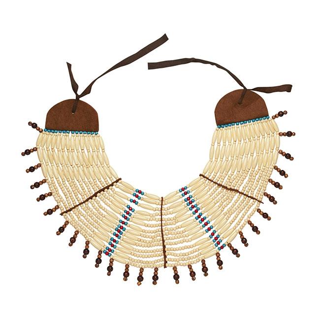 Der Halsschmuck "Indianer" besteht aus Holz und Filzstoff und hat eine Breite von ca. 8 cm. Der Schmuck besteht aus vielen einzelnen Holzelementen, welche braun-, rot- und türkisfarben sind. An beiden Enden der Holzelemente sind Filzapplikationen zu finden, die mit einer Kordel durchsetzt sind mit der der Schmuck im Nackenbereich befestigt werden kann.