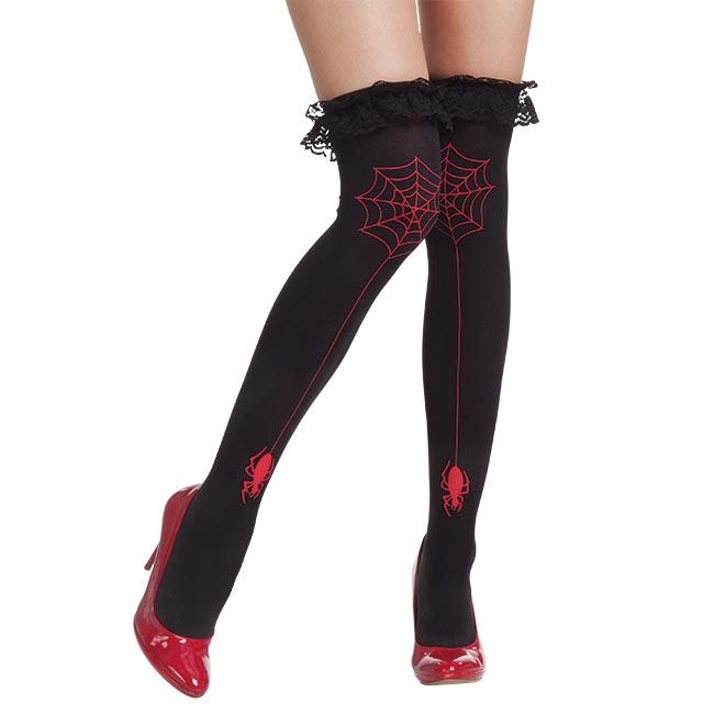 Mehr Info: Tipp: Zu den schwarzen Kniestrümpfen mit rotem Spinnen-Motiv passen rote Pumps oder Ähnliches besonders gut, da sie den sexy Look der Strümpfe unterstreichen.