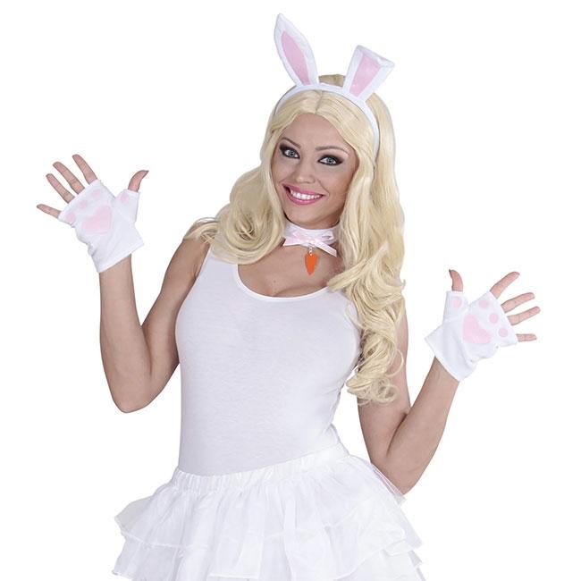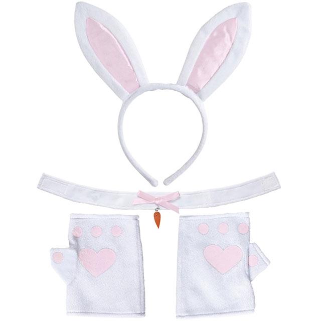 Das Hasen-Set besteht aus 4 Teilen. Auf der Unterseite der Handschuhe finden sich unter jedem Finger rosafarbene Punkte, in der Mitte der Handschuhe ein rosafarbenes Herz. Das Halsband trägt auf der Vorderseite eine rosafarbene Schleife, an der per Öse eine kleine Möhre angebracht ist. Die Ohren werden mit Hilfe eines Haarreifen aufgesetzt.