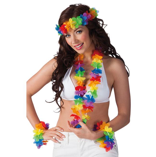 Das Hawaii-Set Promo ist ein günstiges, vierteiliges Accessoire-Set. Es besteht aus einer Blumenkette, zwei Armbändern und einem Stirnband aus bunten Blüten. Wegen seines niedrigen Preises wird das vierteilige Hawaii-Set Promo auch gerne direkt in größeren Mengen bestellt.