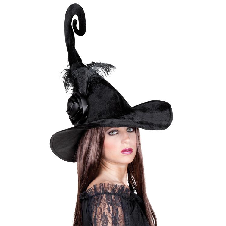 Dieser schöne schwarze Hexenhut hat einen Durchmesser von ca. 43 cm. Besonders auffällig ist die Spitze des Hutes: Sie ist wie ein Skorpionschwanz gebogen.