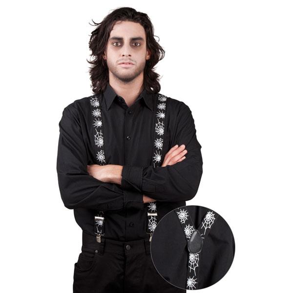 Wenn Sie zu Ihrem Kostüm noch passende Accessoires suchen, dann sind Sie hier in unserem Onlineshop genau richtig. Diese Hosenträger werden in einer Einheitsgröße zu Ihnen nach Hause geliefert. Sie sind schwarz und mit vielen kleinen, weißen Spinnennetzen verziert. Die Hosenträger sind dehnbar und passen daher so gut wie jeder Größe.