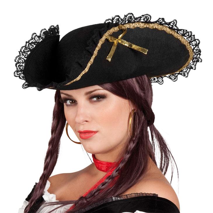 Es ist mal wieder Karneval oder Fasching und Sie wissen immer noch nicht welches Kostüm Sie tragen wollen? Wie wäre es mit einem tollen Piratenkostüm! Dieser schicke Hut macht eine ganz besondere Piratendame aus Ihnen. Zwei goldene Schleifen und eine goldene Umrandung machen den Hut zu etwas ganz Besonderem. Durch zwei Druckknöpfe kann der Hut wie auf dem Foto geformt und befestigt werden. Er misst einen Durchmesser von ca 45cm.