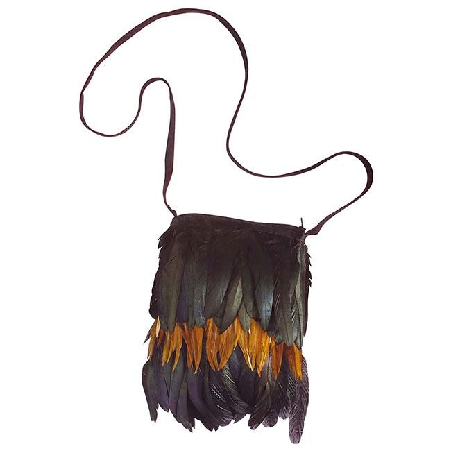 Die Indianer-Handtasche ist schwarz und hat eine Maße von ca. 20 x 25 cm. Mit Federn gemessen erreicht sie sogar eine Höhe von ca. 31 cm. An der Tasche sind sowohl braune als auch schwarze Federn angeklebt, letztere schimmern im Licht sogar grün und teilweise blau. Die Tasche kann mithilfe des langen Riemens ganz einfach um die Schulter gelegt werden. Dank des Reißverschlusses sind Ihre kleinen Habseligkeiten gut verstaut.