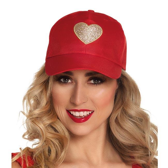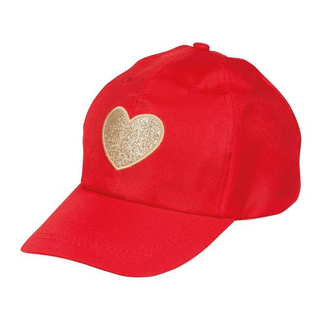 Die Kappe "Goldenes Herz" wird in einer Einheitsgröße für Erwachsene geliefert. Sie lässt sich jedoch am Hinterkopf mit einem Klettverschluss verstellen. Im Stirnbereich befindet sich auf der roten Kappe ein goldenes Glitzerherz.