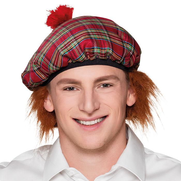 Was wird der Schotte wohl unter seinem Kilt tragen?! Was dieser allerdings unter seiner Mütze trägt, ist hier schon zu deuten, denn der rot-bräunliche Schopf sind bei der originellen Schotten-Mütze bereits angenäht. Die Mütze ist typischem Karomuster, in den Farben rot, schwarz, weiß, blau, gelb und grün, gefertigt und hat in der Kopfmitte den lustigen, roten Bömmel angebracht.