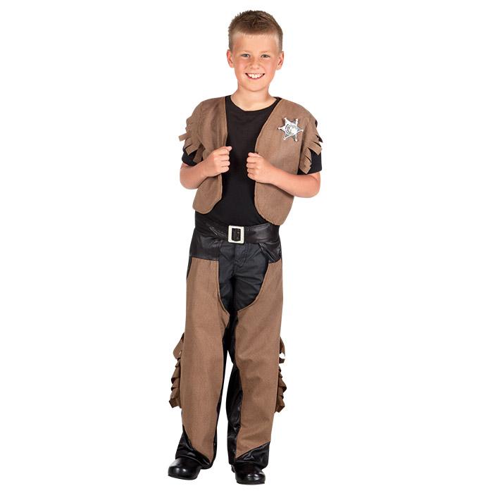 Das Kinder-Kostüm "Mutiger Cowboy" ist dreiteilig und besteht aus einer Weste und Chaps. Die beiden Einzelteile sind in den Farben Braun und Schwarz gestaltet und mit den typischen Cowboy-Fransen verziert. Die linke Seite der Weste schmückt außerdem ein silberner Sheriff-Stern. Bei der Hose ist ein schwarzer Gürtel mit silberner Schnalle angedeutet. Das Kostüm ist in den Kinder-Größen 4-6 Jahre, 7-9 Jahre und 10-12 Jahre erhältlich.