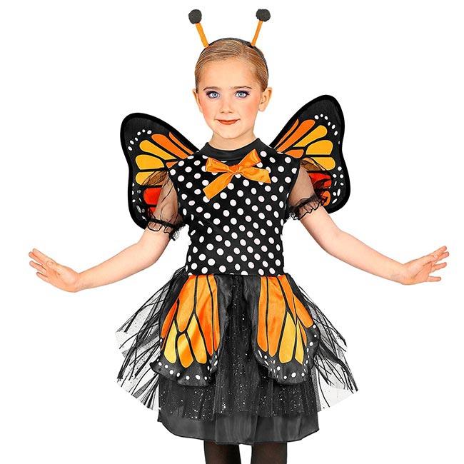 Das Kinder-Kostüm Schmetterling wird 3-tlg. geliefert. Zum Lieferumfang gehören das süße Kleid mit abstehendem Rock, die Flügel, die mit Klett hinten an das Kleid gemacht werden können sowie der Haarreif mit Fühlern.