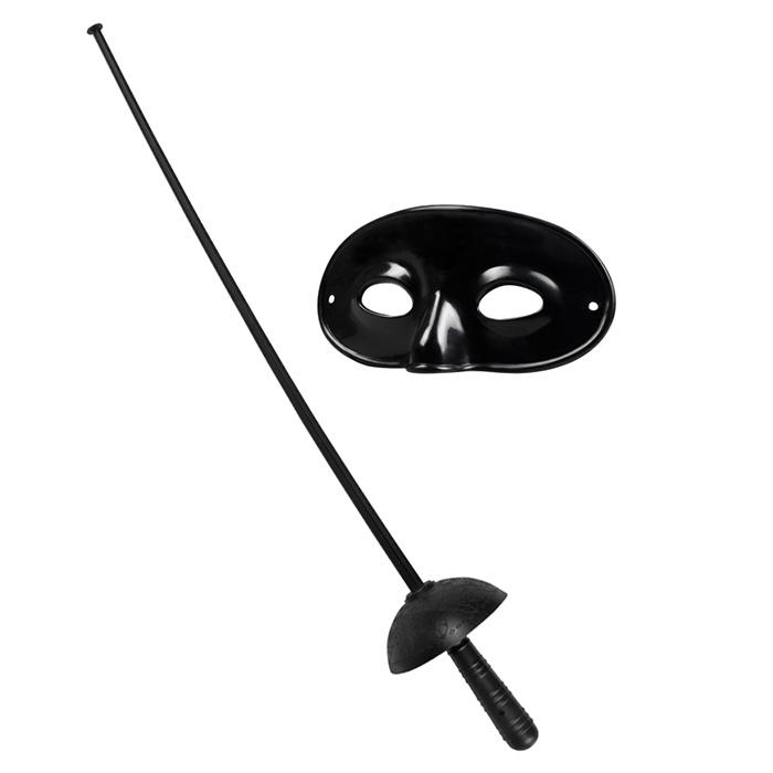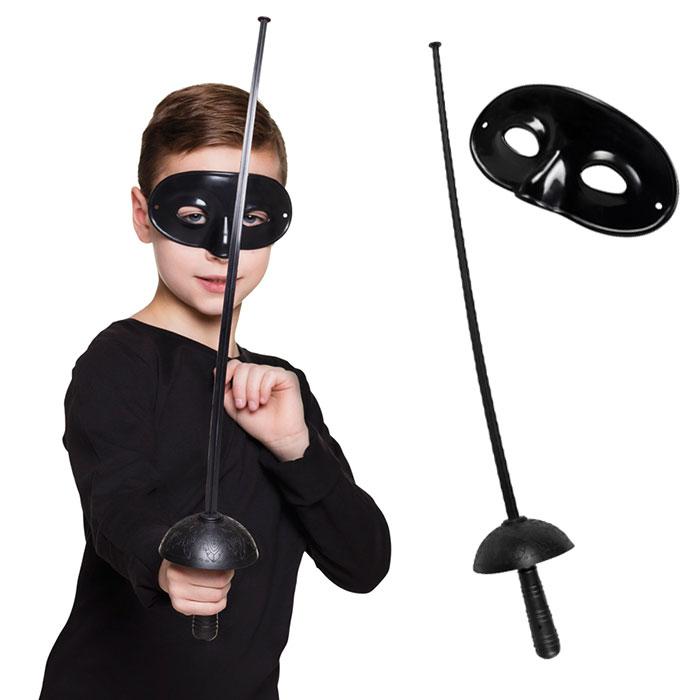 Das Kinder-Set "Maskierter Rächer" ist 2-tlg. und besteht aus einer schwarzen Augenmaske aus Kunststoff und einem schwarzen Kunststoff Degen. Der Degen ist, inklusive Griff, ca. 59,5 cm lang und am Ende abgeflacht um Verletzungen vorzubeugen. Die Maske ist ca. 8,5 cm hoch und ca. 15 cm breit. Das Gummiband auf der Rückseite sorgt für einen sicheren Halt.
