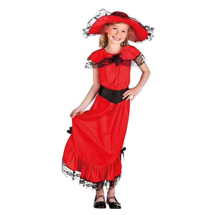 Das Kinderkostüm "Scarlett" ist dunkelrot und hat schwarze Applikationen, die den edlen Look dieses Outfits abrunden. Das Kostüm besteht aus 3 Teilen, einem Hut, einem Kleid und dem dazugehörigen Gürtel. Passend sind die Elemente für Kinder im Alter von ca. 7-9 Jahren.