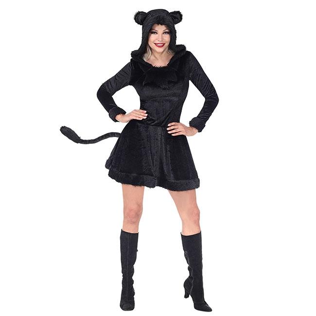 Verwandeln Sie sich in einen anmutigen Panther! Kombiniert mit einer schwarzen Leggings oder einer Strumpfhose, sind Sie mit diesem tollen schwarzen Kleid mit Kapuze perfekt gerüstet. Je nach Auswahl kann zwischen den Größen S, M, L oder XL gewählt werden. Bitte beachten Sie die Maße. Im Taillenbereich ist ein elastischer Bund eingearbeitet. Kapuze, Saum und Handabschlüsse sind mit Details abgesetzt. Der lange Schwanz und die niedlichen Ohren machen das Kostüm perfekt. Das Kleid wird im Nacken durch einen Klettverschluss geschlossen. Im Lieferumfang ist ausschließlich das Kleid in der von Ihnen gewählten Größe enthalten. Andere abgebildete Artikel werden NICHT mitgeliefert.