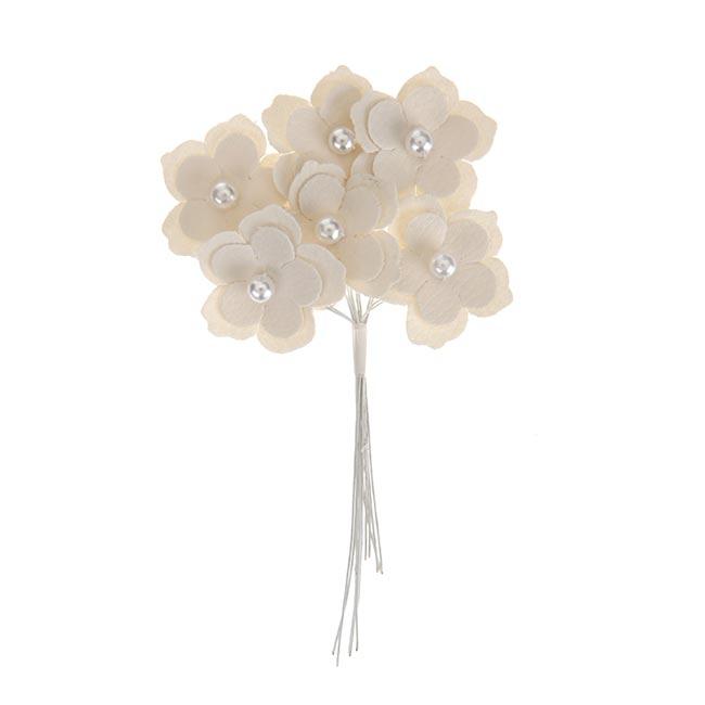 Ein wahrer Hingucker! Die kleinen Blüten bestehen aus weißem Kunstleder und sind jeweils mit einer Perle aus Kunststoff verziert. Pro Packung sind 5 Blüten (ca. 3 cm) enthalten. Sie sind an einem weißen Draht befestigt, und können so nach Belieben dekoriert werden.