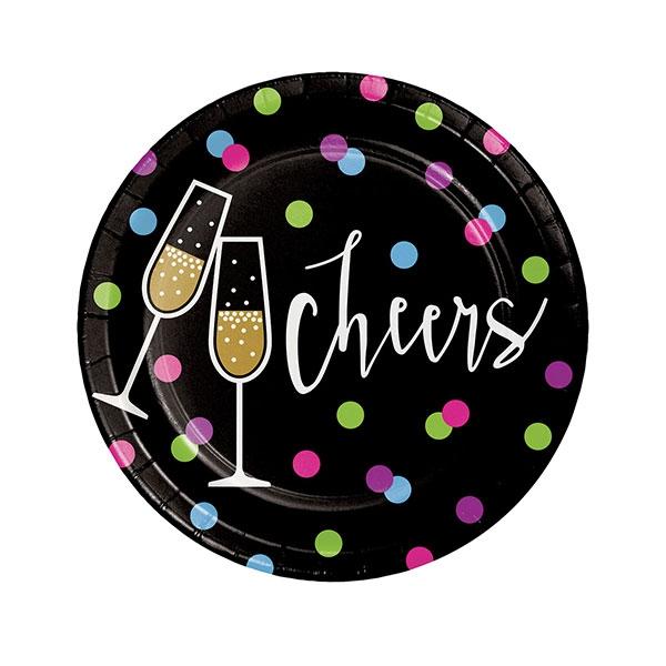 Die kleinen Pappteller "Buntes neues Jahr" werden im 8er Pack geliefert und bestehen aus Pappe. Sie haben einen Durchmesser von ca. 17,5 cm. Die Pappteller sind schwarz mit bunten Punkten bedruckt. Auf ihnen ist der Schriftzug "Cheers" und zwei Sektgläser aufgedruckt.