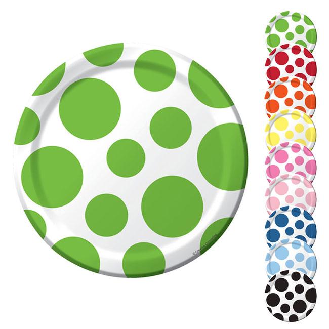 Die Pappteller "Crazy Punkte" sind aus Pappe gefertigt und haben einen Durchmesser von ca. 18 cm. Das Produkt kommt im 8er Pack zu Ihnen nach Hause. Sie haben die Wahl zwischen neun verschiedenen Farbvarianten: Grün, Rot, Orange, Gelb, Pink, Rosa, Blau, Hellblau oder Schwarz. Die weißen Pappteller sind dann mit verschieden großen Punkten in der von Ihnen gewählten Farbe verziert.