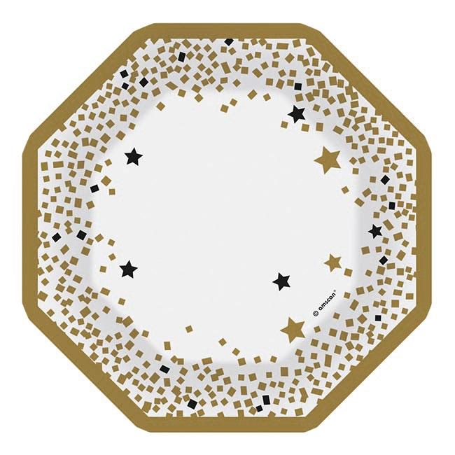 Die achteckigen kleinen Pappteller "Goldene Silvesternacht" werden im 6er Pack geliefert. Sie sind einseitig mit goldenen und schwarzen Quadraten und Rechtecken bedruckt. Der Hintergrund ist weiß, der Rand golden. Die Teller haben eine Größe von ca. 18,5 x 18,5 cm und sind etwas tiefer.