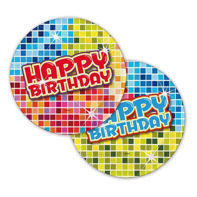 Diese kleinen Pappteller eignen sich bestens für einen kleinen Snack oder ein bisschen Kartoffelsalat mit einem Würstchen. Die Pappteller haben einen Durchmesser von ca. 18 cm und werden im 6er Pack geliefert. Sie sind mit bunten Vierecken bedruckt. Er ist schrill und bunt, sodass er super in die 80er Jahre passt. Der Pappteller ist mit "Happy Birthday" bedruckt. Er eignet sich also für jeden Geburtstag!