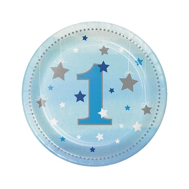 Die kleinen Pappteller "Little Star" werden im 8er Pack geliefert. Sie haben einen Durchmesser von ca. 17,5 cm. Es kann je nach Auswahl zwischen den Farben Blau und Rosa gewählt werden. Die Teller sind jeweils mit einer 1 bedruckt. Die blauen Teller sind mit silbernen Details bedruckt, die Teller in der Farbe Rosa mit goldenen Details.