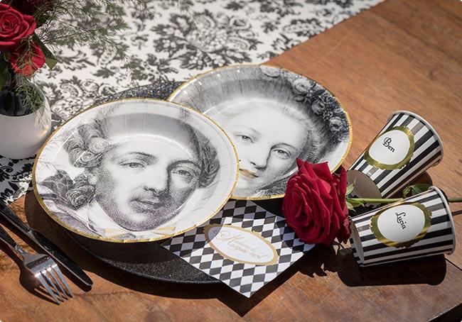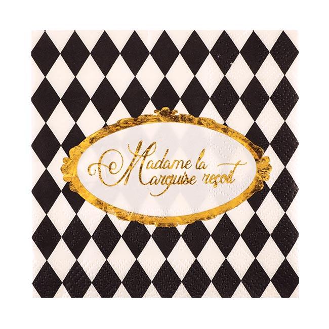 Die kleinen Servietten "Royales Fest" bestehen aus Papier und werden im 20er Pack geliefert. Aufgefaltet sind sie ca. 25 x 25 cm groß. Schwarze und weiße Rauten prägen den Gesamteindruck. Golden eingerahmt hebt sich der Schriftzug "Madame la Marquise reçoit" besonders schön ab.