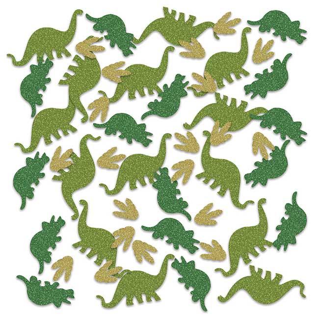Das Konfetti Glitzer Dinosaurier beinhaltet einen Beutel mit 14 Gramm Konfetti. Die einzelnen Konfettis sind beidseitig in verschiedenen Grüntönen bedruckt und auch auf beiden Seiten glitzernd beschichtet. Es gibt drei verschiedene Konfetti-Motive: Brontosaurus (ca. 5,6 cm), Triceratops (ca. 3,8 cm) und ein Dino-Fußabdruck (ca. 2 cm).