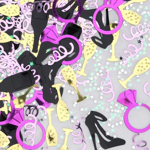 Vor der Hochzeit ist es natürlich ganz wichtig, einen Junggesellenabschied zu planen und zu feiern. Und besonders an so einem Tag muss ganz viel Spiel und Spaß und natürlich auch Deko her. Mit diesem Konfetti können Sie den Tisch hervorragend für die Junggesellenabschied-Party dekorieren. Das Konfetti hat ca. 14 Gramm Gewicht und besteht aus kleinen silbernen Sternchen, aus goldenen Sektgläsern, aus schwarzen Flaschen und Schuhen und aus extra großen pinken Ringen. Eben perfekt für Frauen!