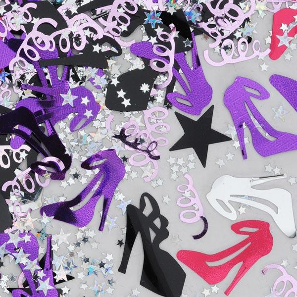 Das Konfetti "Ladys Night" umfasst 7 unterschiedliche Motive und gehört damit zu den Abwechslungsreichsten, die wir im Angebot haben. Highheels in den Farben Pink, Lila und Schwarz, Luftschlangen in rosa und dazu Sterne in Schwarz und Silber machen aus dieser metallischen Folie etwas ganz einzigartiges. Perfekt für den Tisch auf Ihrem Junggesellinnen-Abschied, Ihrem Mädels-Abend oder andere Anlässe, die ganz im Zeichen der Lady steht! Genießen Sie Ihre Party!
