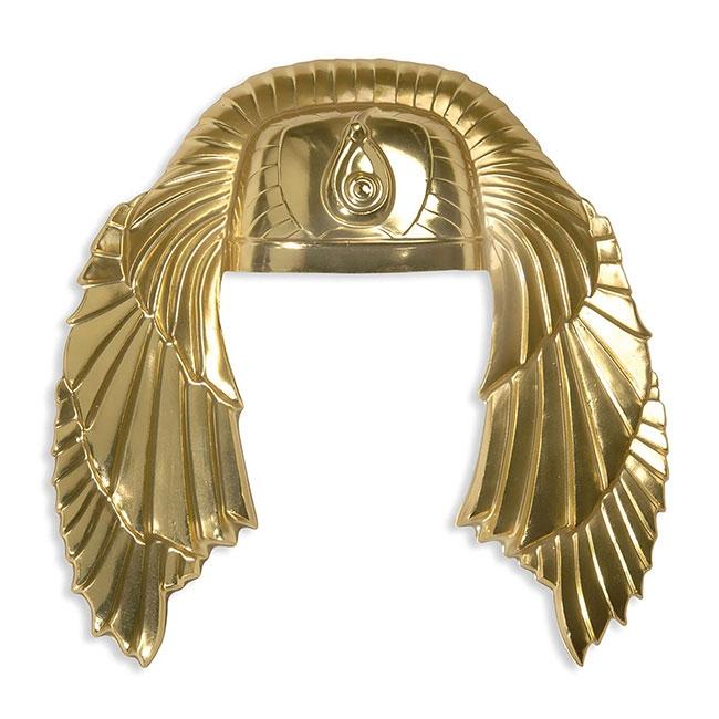 Der Kopfaufsatz "Kleopatra" ist glänzend-goldfarben und besteht aus Kunststoff. Mit einer Breite von ca. 38 cm und einer Länge von ca. 44 cm deckt der Aufsatz Stirn und Ohren ab. Befestigt wird dieser Kopfschmuck über eine gespannte Schnur.