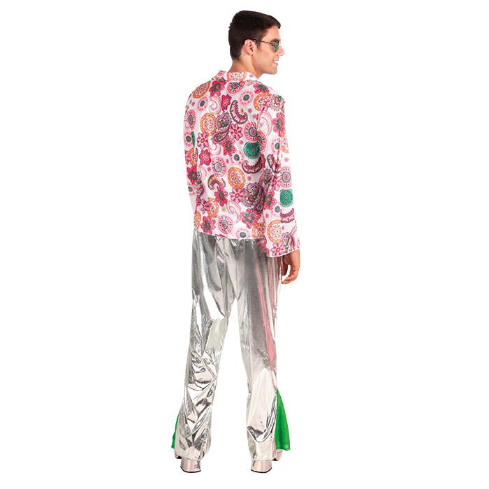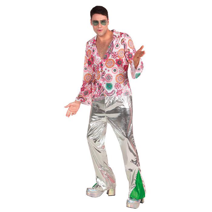 Dieses Hippie Kostüm erinnert nicht nur an die 60er Jahre der Hippie Zeit, sondern auch an die Disco Zeit der 70er. Das Kostüm für Männer wird zweiteilig geliefert und besteht aus einem bunten Shirt mit unterschiedlichen Motiven und einer Hose in silberner Metallic-Optik. Das Kostüm wird in der Einheitsgröße M/L geliefert.