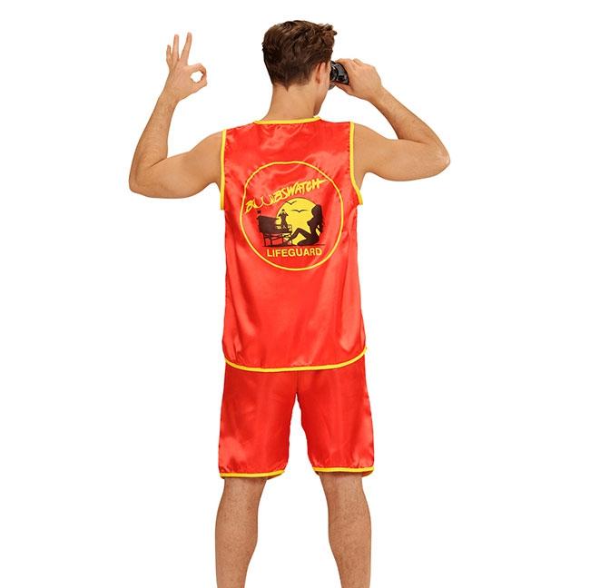Das Kostüm "Boobswatch" ist hauptsächlich in den Farben Rot und Gelb gehalten. Es ist in gelber Schrift mit "Boobswatch" und auf der Rückseite mit "Lifeguard" beschriftet. Außerdem sind die Kleidungsstücke auch mit einer untergehenden Sonne, der Silhouette einer Frau und den Umrissen eines Rettungsturms bedruckt. Das Kostüm ist in den Größen M oder L erhältlich. Je nach Auswahl beträgt die Länge des Oberteils ca. 72 cm (L) oder ca. 69 cm (M). Die Hose ist bei beiden Größen ca. 54 cm lang. Bitte beachten Sie, dass lediglich die Hose und das Oberteil im Lieferumfang enthalten sind. Alle anderen Artikel, die Sie der Abbildung entnehmen können, werden NICHT geliefert.