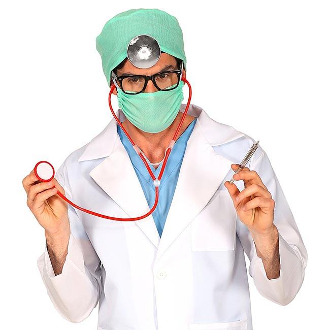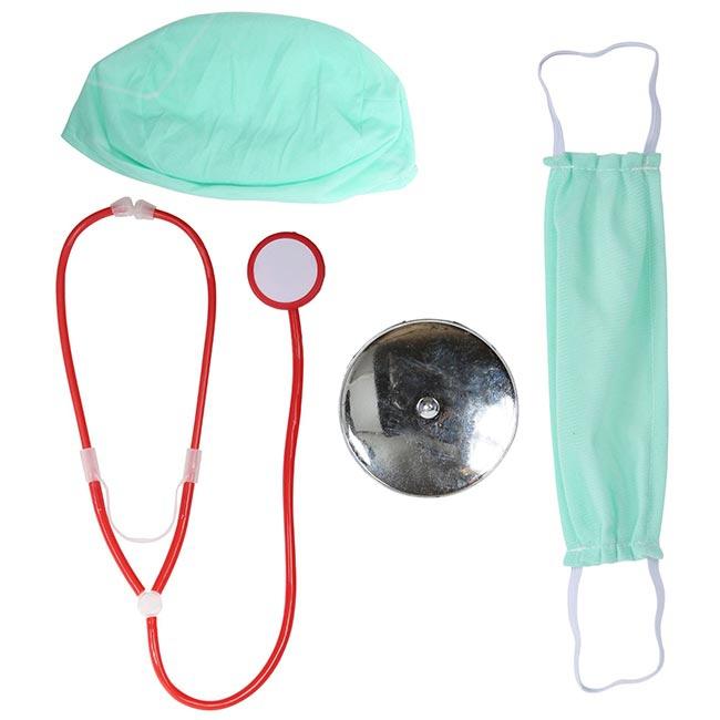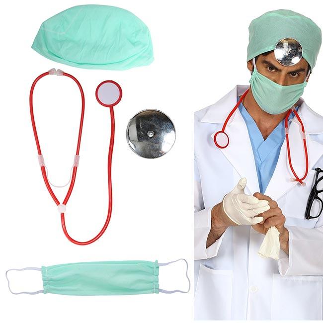 Das Kostüm-Set Arzt umfasst vier Teile: Ein rotes Stethoskop, eine türkisgrüne Haube, einen silberfarbenen Stirnreflektor und einen türkisgrünen Mundschutz. Alle anderen Artikel, die Sie den Abbildungen entnehmen können, werden NICHT geliefert. Stirnreflektor und Mundschutz sind außerdem mit weißen, elastischen Bändern ausgestattet. Alles wird in einer Einheitsgröße für Erwachsene geliefert.