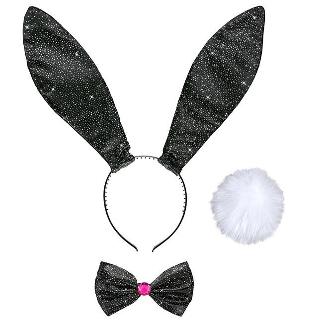 Das Kostüm-Set besteht aus einem Haarreif, an dem lange Hasen-Ohren befestigt sind, einer Fliege, die mit Hilfe eines elastischen Bandes angezogen werden kann und einem weißen Schwanz, der mit Hilfe einer Sicherheitsnadel befestigt wird. Sowohl die Fliege, als auch die Ohren sind in schwarz gehalten und mit silbernen Glitzerpartikeln bestäubt.