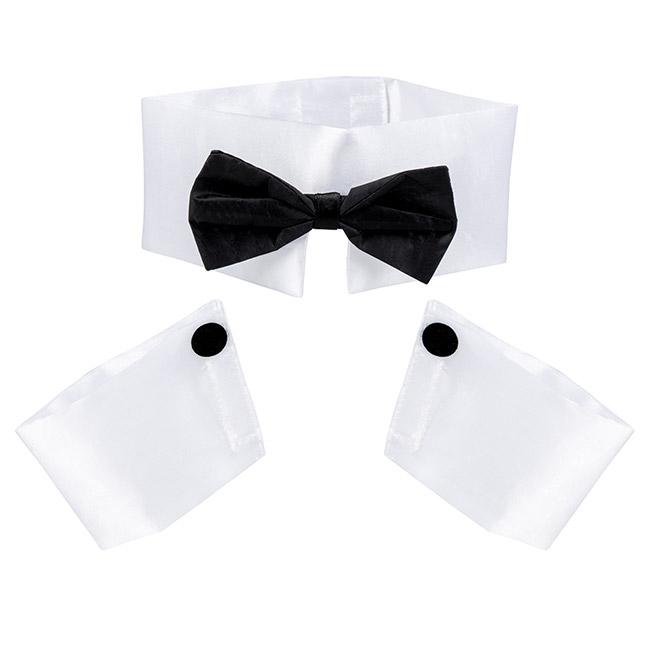 Sonstiges: Lieferumfang enthält: Ein Halsband mit Fliege und zwei Manschetten-Ärmel. Das Halsband und die Manschetten-Ärmel werden mit Hilfe von verdeckten Klettverschlüssen geschlossen.