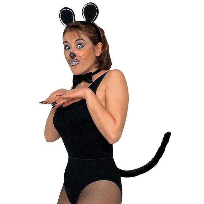 Das Kostüm-Set "Maus" besteht aus mehreren Teilen. Im Set befinden sich Ohren, die über einem Haarreifen getragen werden, eine Fliege, sowie ein Schwanz. Die Ohren sind vorderseitig mit einer glänzend-silbernen Applikation versehen.
