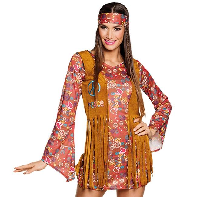 Love and Peace! Wenn das auch Ihr Motto ist, dann schmeißen Sie sich in dieses tolle Kostüm und verbreiten sie good vibes. Das Kostüm "Sexy Hippie Girl" ist 4-teilig und beinhaltet ein Kleid mit fest vernähter Weste, ein Stirnband (ca. 115 cm) zum selber binden sowie zwei Beinstulpen (ca. 53 cm inkl. Fransen) mit elastischem Bund. Das Kostüm kann in den Größen 36/38 oder 40/42 bestellt werden, bitte beachten Sie die Maße. Die Weste ist bereits mit dem Kostüm vernäht. Das rotbraune Kleid ist mit allerhand farbenfrohen Blümchen sowie Peace-Zeichen bedruckt, die Ärmel sind ausgestellt. Besonderer Blickfang ist das Peace-Zeichen und das Wort Peace auf der Weste. Diese sind nicht etwas gedruckt, sondern mit farbenfrohem Garn gestickt. Im Lieferumfang ist ausschließlich ein Kleid in der von Ihnen gewählten Größe, zwei Stulpen sowie ein Stirnband enthalten. Andere abgebildete Artikel werden NICHT mitgeliefert.