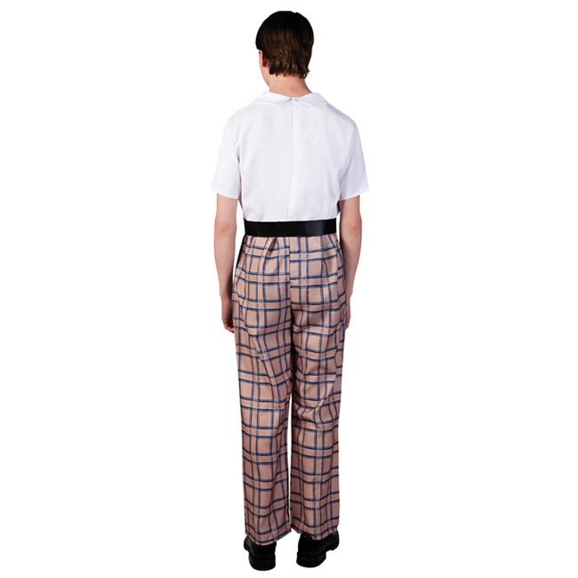 Das Kostüm "Streber" ist dreiteilig und besteht aus einem Einteiler, einer Fliege und einem Gürtel. Der Artikel ist in zwei verschiedenen Herren-Größen erhältlich. Die Größe 50/52 hat von Schulter bis Saum gemessen eine Länge von ca. 150 cm, die Größe 54/56 eine Länge von ca. 155 cm. Der Einteiler stellt obenherum ein weißes Hemd mit einer Hemdtasche, gefüllt mit Schreibwaren wie Kuli und Textmarker, dar. Die angedeutete Hose ist beige-blau kariert. Dazu gehören eine Fliege in demselben Muster und ein schwarzer Gürtel.