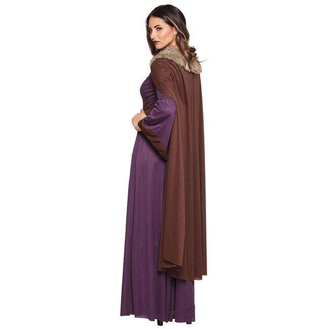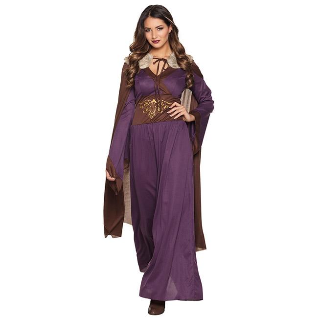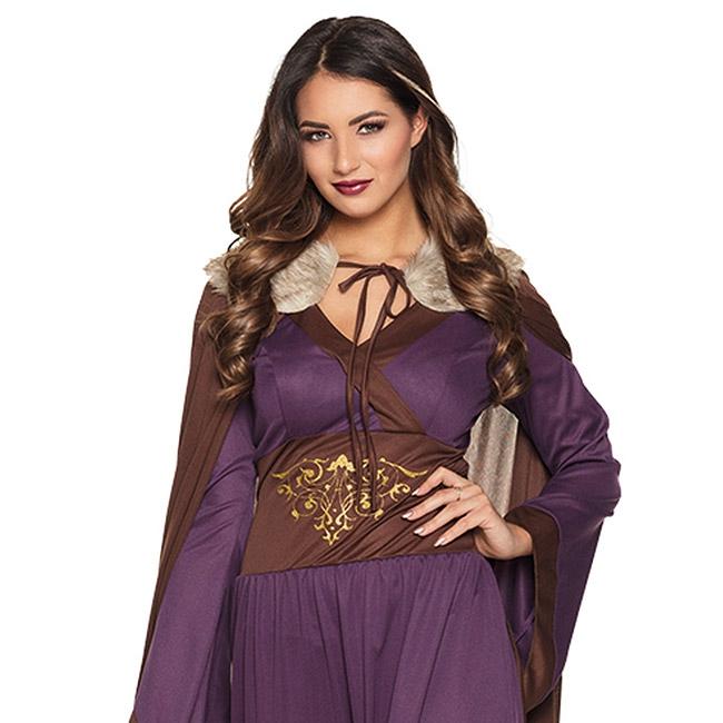 Nicht immer nur die starke Kriegerin sein. Auch Wikingerfrauen mögen es elegant. Das Kostüm „Wikingerin Freya“ ist 2-teilig und besteht aus einem Kleid und einem Mantel. Es kann zwischen den Größen 36/38 oder 40/42 gewählt werden. Bitte beachten Sie die Maße! Das Kleid ist leicht dehnbar, hat Trompetenärmel und ist lila. Braune Bordüren an Ärmeln, Ausschnitt und im Bauchbereich setzten schicke Akzente. Der braune Einsatz im Bauchbereich ist zusätzlich mit einem filigranen, golden glitzernden Muster bedruckt. Auch der braune Umhang kommt nicht ohne ein Highlight aus, welches in diesem Fall ein braun-beige melierter Kragen ist. Im Lieferumfang ist ausschließlich ein Kleid und ein Umhang in der von Ihnen gewählten Größe enthalten. Andere abgebildete Artikel werden NICHT mitgeliefert.
