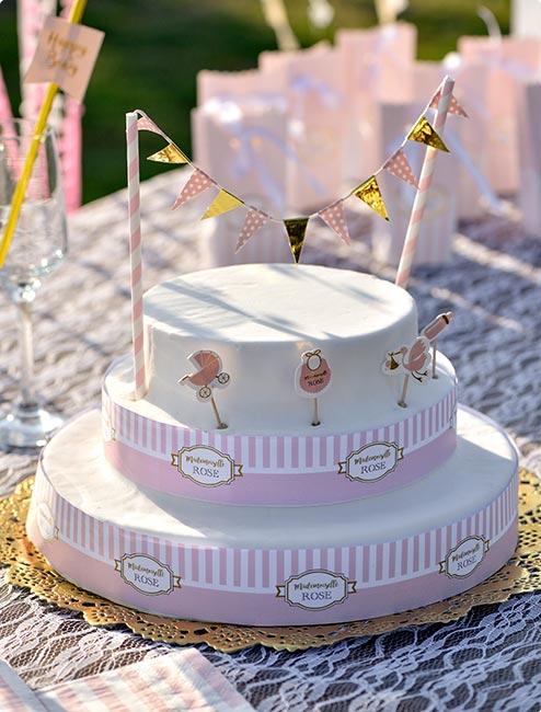 Mehr Info: Bei einer edlen Babyparty darf natürlich der passende Kuchen nicht fehlen. Mit dieser edlen Kuchendeko setzen Sie den Kuchen wunderbar in Szene.