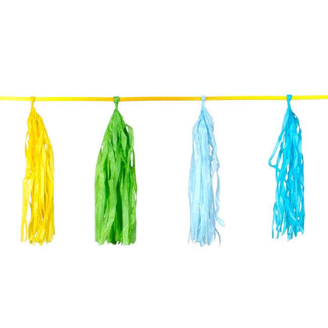 Die Girlande hat eine Länge von ca. 3 m und besteht aus 9 jeweils 50 cm langen Zipfeln. Ein Zipfel ist hierbei einfarbig, sodass die Girlande als Ganze kunterbunt ist, die Zipfel bestehen aus Krepppapier.