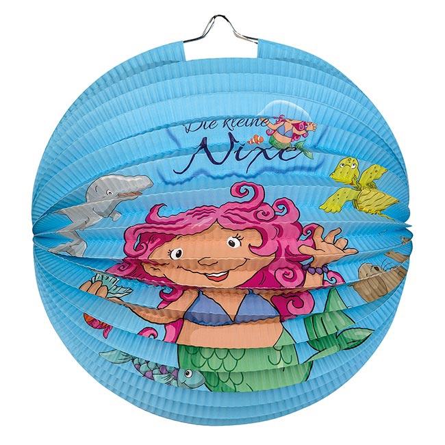 Der Lampion "Die kleine Nixe" besteht aus Papier und hat einen Durchmesser von ca. 25 cm. Aufgrund der Metall-Vorrichtung kann er ganz einfach an einer Decke befestigt werden. Er ist außerdem auch mit einer Halterung für eine Kerze ausgestattet. Der Lampion ist blau und zeigt die kleine Nixe umgeben von ihren tierischen Freunden.