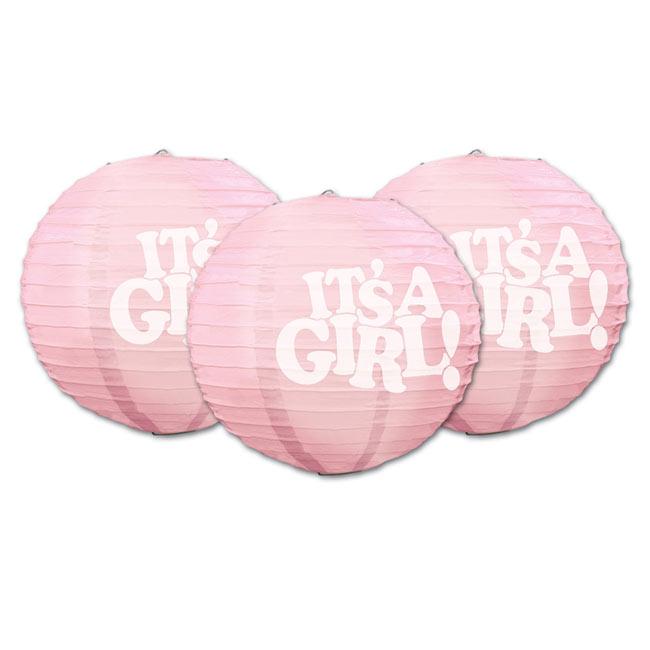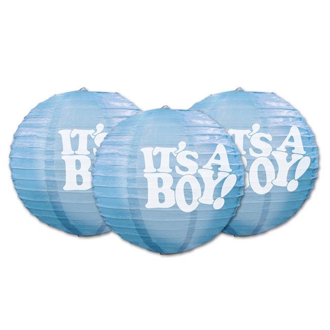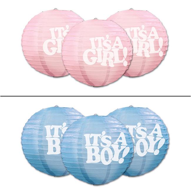 Mit den Lampions "It's a baby" dekorieren Sie für die Baby-Party einfach herrlich süß. Die Lampions sind im 3er Pack und in den Farben Hellblau und Rosa erhältlich. Je nach Farbe variiert natürlich auch der Schriftzug, entweder It's a boy oder It's a girl. So können Sie ganz individuell dekorieren. Die Lampions haben einen Durchmesser von ca. 24 cm und sind aus Papier gefertigt. Die Halterung ist aus Metall gefertigt und lässt sich problemlos an einen Haken hängen.