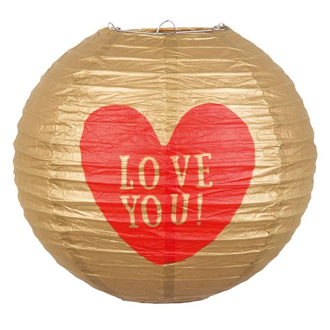 Der Lampion "Love You" besteht aus Papier und kann aufgrund der Metall-Halterung ganz einfach aufgehängt werden. Der Durchmesser beträgt ca. 25 cm. Farblich ist der Lampion in Gold gehalten worden. Ein rotes Herz mit der Aufschrift "Love You" macht das Produkt zu einem richtigen Hingucker.