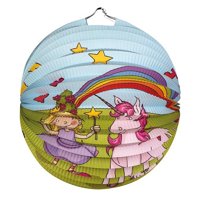 Der Lampion "Mädchentraum" hat einen Durchmesser von ca. 25 cm und besteht aus schwer entflammbarem Papier. Er wird gefaltet geliefert und muss noch selbst entfaltet werden. Als Motiv zeigt er die kleine Prinzessin mit ihrem Einhorn. Im Hintergrund ist ein Regenbogen zu sehen. Zur Befestigung ist ein Metalldraht angebracht.